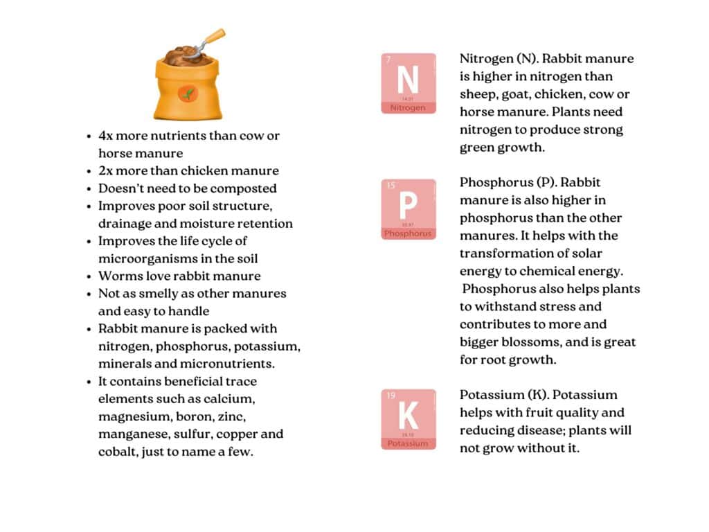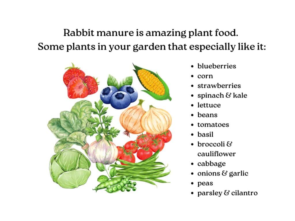 Rabbit manure (rabbit droppings) is one of the only manures you can apply directly to your garden without composting first. It’s called a cold manure.